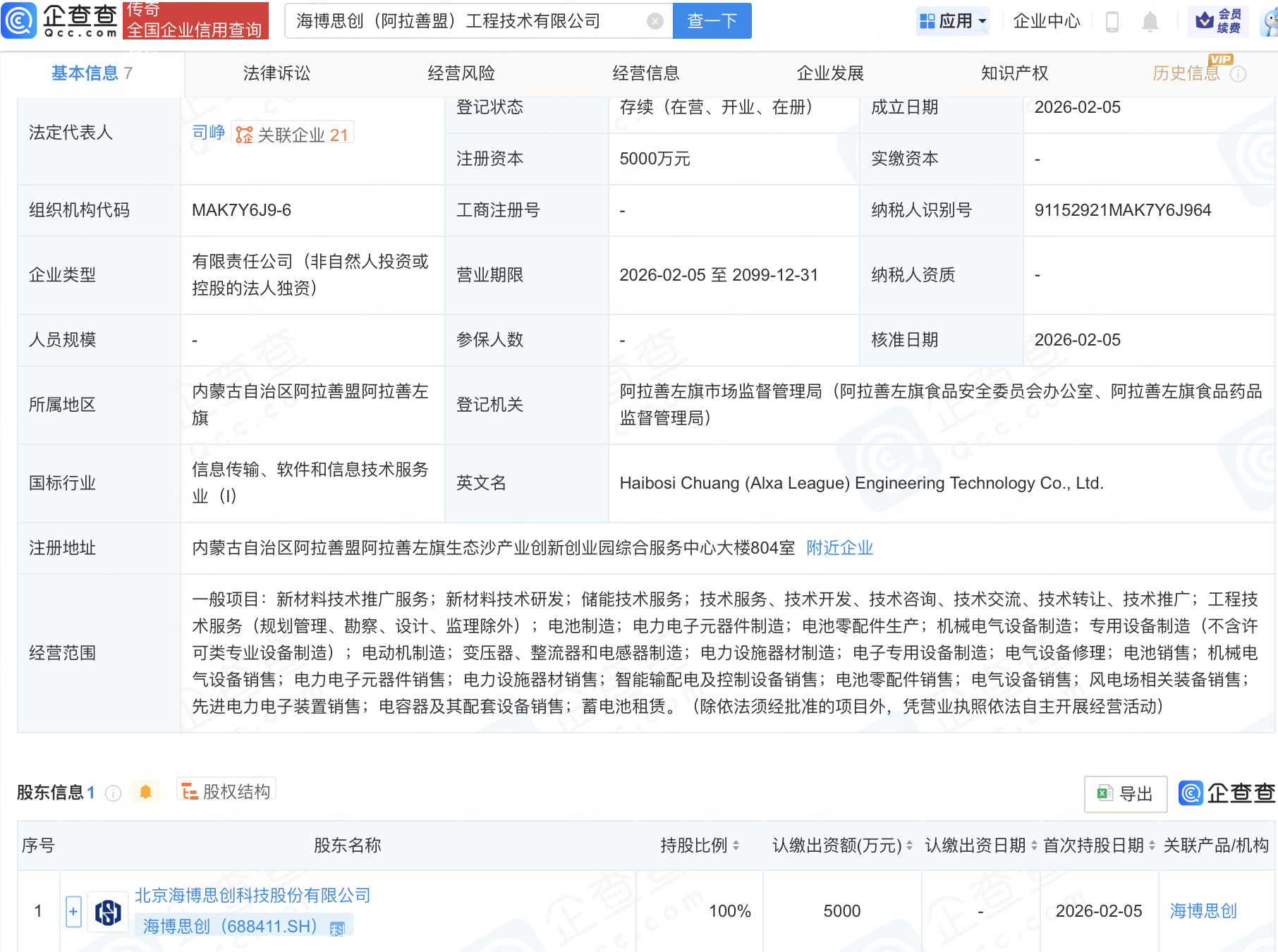 近日,海博思创(阿拉善盟)工程技术有限公司成立,注册资本5000万元,经营范围包含:风电场相关装备销售;先进电力电子装置销售;电容器及其配套设备销售;蓄电池租赁等。企查查股权穿透显示,该公司由海博思创(688411)全资持股。
